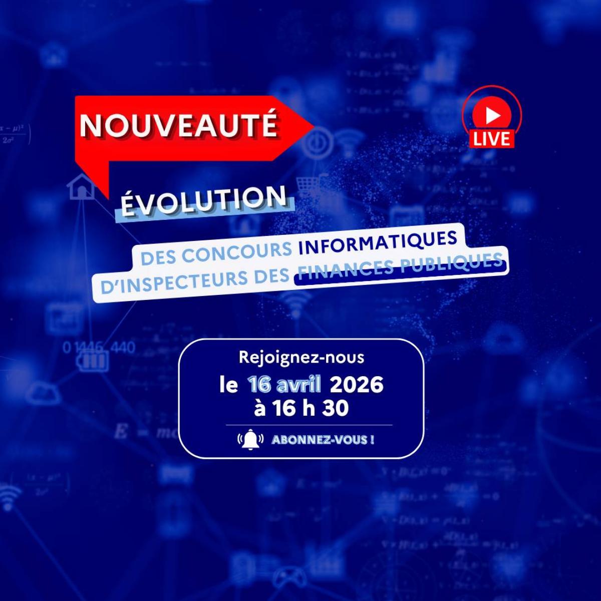 Le 16 avril prochain, l'École nationale des Finances publiques organise un YouTube Live, consacré aux évolutions des concours informatiques d'inspecteurs des Finances publiques !
